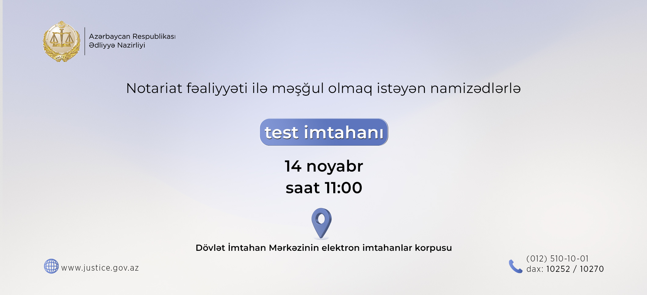 Ədliyyə Nazirliyinin İxtisas Komissiyası tərəfindən notariat fəaliyyəti ilə peşəkarcasına məşğul olmaq üçün şəhadətnamə almaq istəyən və “Notariat haqqında” Qanunun tələblərinə cavab verən ali hüquq təhsilli Azərbaycan Respublikası vətəndaşları üçün növbəti açıq müsabiqə elan edilib.